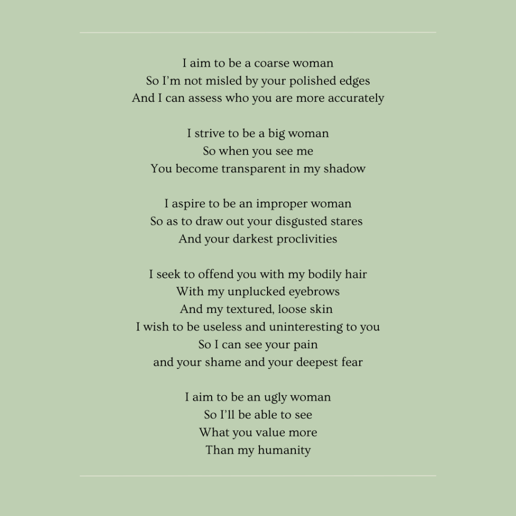 Women don’t owe you pretty – it is the title of a book by Florence Given, one I highly recommend to ease you into some fundamentally feminist thought. It is something that you perhaps think you know, but you must learn to embody it as well. No one owes anyone pretty – we are humans, not shiny objects to look at. Celebrate every part of your vessel, it is the very thing carrying you through life. I wrote this poem ‘ugly woman’ shortly before turning thirty. I had been most painfully reminded that many men feel entitled to your body, and what they believe to be beauty, and that they somehow have a ‘right’ to demand your body doesn’t change throughout time – or at least as little as humanly possible. It opened my eyes to who they really are… and how they see me.