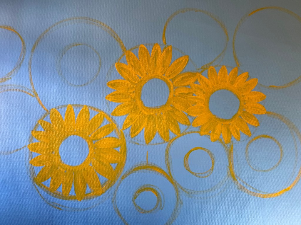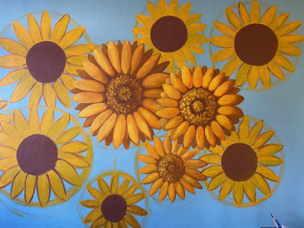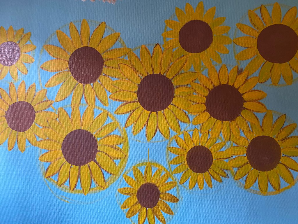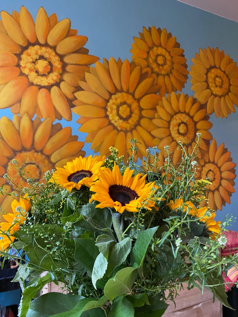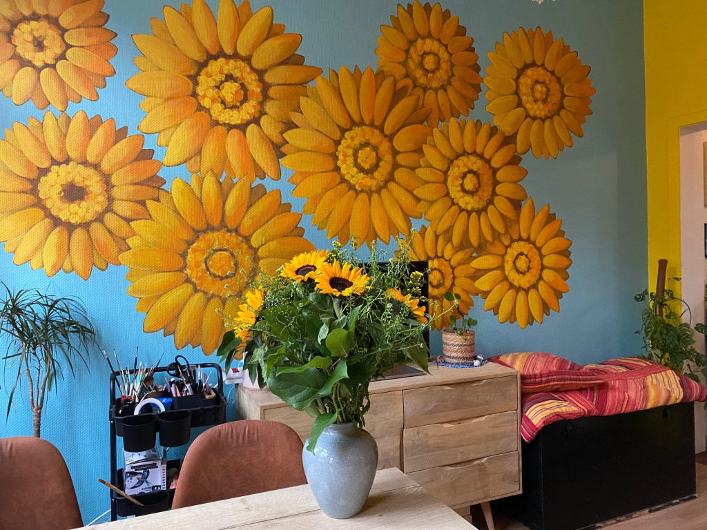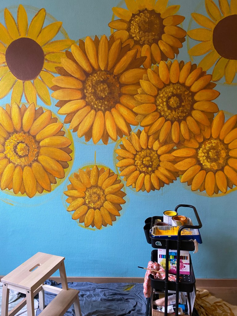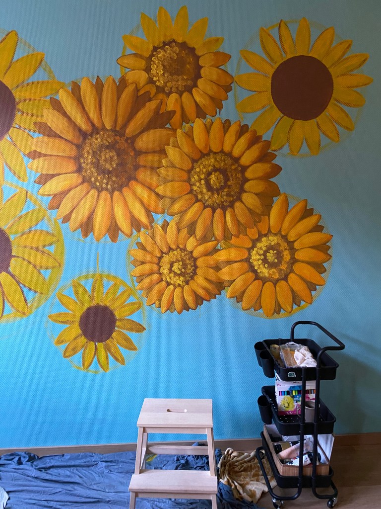 I did it! I painted my first mural. I knew I wanted a wall of sunflowers when I first entered this home. That’s why I prepared by painting the wall blue. The other three living room walls were painted in differing shades of yellow and orange. I used those paint leftovers to paint these sunflowers, adding some brown paint I got seperately. I am in love with this wall! Come spring and summer it will be even more gorgeous.